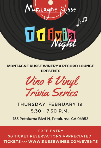 The first trivia night of 2026 is here! Join us at our tasting room at 5 pm to get settled with your team over some wine, and then trivia starts promptly at 5:30 pm. There will be three rounds, ten questions in each round. Teams of up to six people. A prize will be awarded to the winning team! Hosted by our owner & winemaker, Kevin Bersofsky. Trivia will span a range of trivia categories but always some music involved ;)