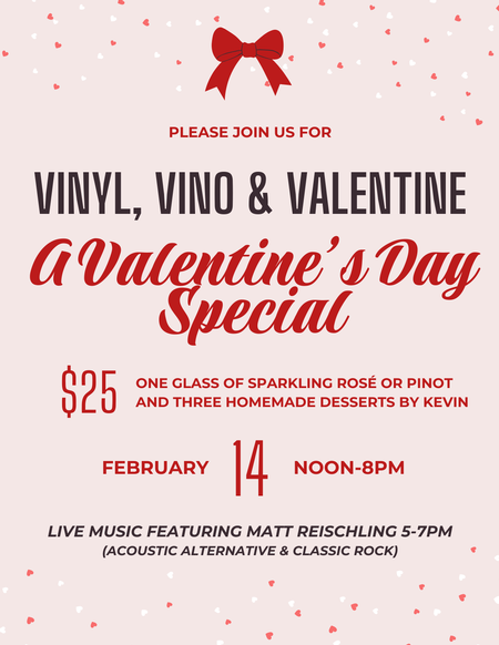 Live Music featuring guitarist and vocalist Matt Rieschling from 5-7pm. Vinyls will be spinning all day before and after to match the Valentine's Day vibes 😉