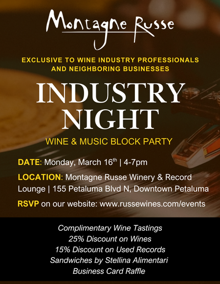 Calling all wine industry professionals and downtown Petaluma businesses - join us for an Industry Open House! If you haven't seen our new tasting room yet, or haven't seen us in a while, please come through for an evening of wine, music, and networking! We'll have complimentary tastings from 4-7pm and mini sandwiches from our neighbors at Stellina Alimentari. Records will be spinning all night, and we're offering 25% off all wines and 15% off all used records ;)