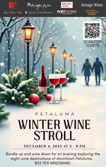 We welcome you to join us for the first ever Petaluma Winter Wine Stroll! Explore the eight wine tasting rooms and wine bars along the one mile span of downtown Petaluma. Each location will be pouring 2-3 of their most popular wines, along with light bites and gifts to peruse through. Get in the holiday spirit by wearing your most festive Christmas sweaters! All wines will be available for purchase to kickstart your holiday shopping.