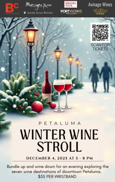 We welcome you to join us for the first ever Petaluma Winter Wine Stroll! Explore the seven wine tasting rooms and wine bars along the one mile span of downtown Petaluma. Each location will be pouring 2-3 of their most popular wines, along with light bites and gifts to peruse through. Get in the holiday spirit by wearing your most festive Christmas sweaters! All wines will be available for purchase to kickstart your holiday shopping.